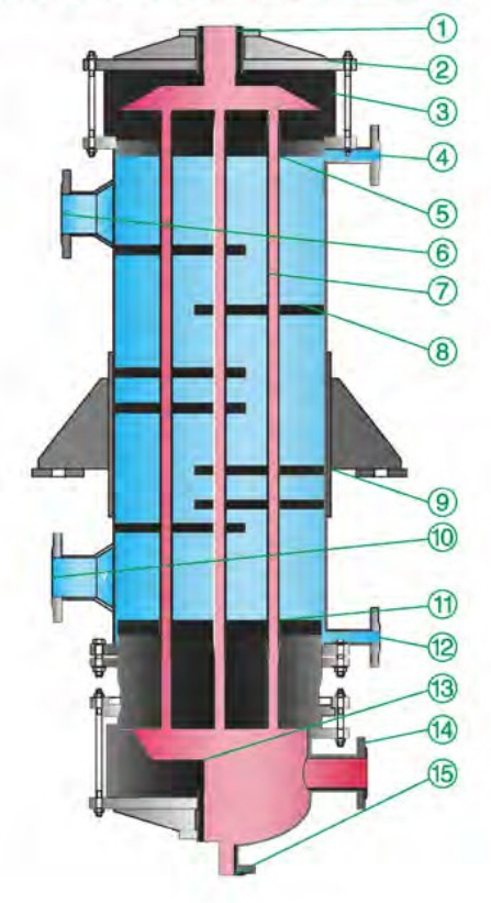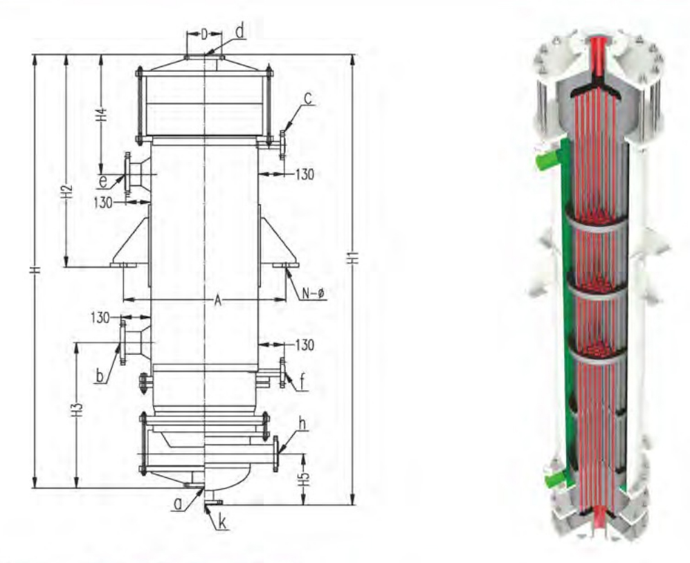 La fabricación de equipos a gran escala es posible gracias a su diseño sencillo, compacto y resistente a los fluidos. Sin embargo, en comparación con el tipo de orificio central, presenta menor resistencia a la temperatura y la presión. Funciona bien en entornos con bajas vibraciones y sin impactos, y se utiliza principalmente como condensador. Existen dos tipos de este equipo: Tipo I y Tipo II. El Tipo II incorpora un separador gas-líquido, mientras que el Tipo I carece de él. El Tipo II se utiliza principalmente como condensador.