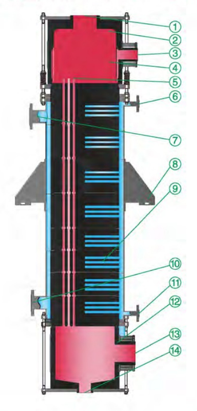 La estructura representa un absorbedor de película descendente de grafito YKX modificado. Este elemento de intercambio de calor por absorción carece de un orificio central. Se trata de un dispositivo de absorción de gases con un rendimiento excepcional, que se distingue por su pequeño tamaño y su relativamente alta tasa de utilización del material.