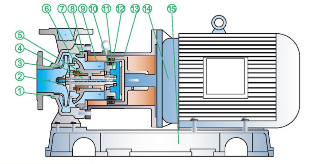 | ②Tuerca del impulsor | 304/316/316L | 5. Tapa de la bomba | 304/316/316L | ⑫ imán de salida | imán permanente /HT200 |