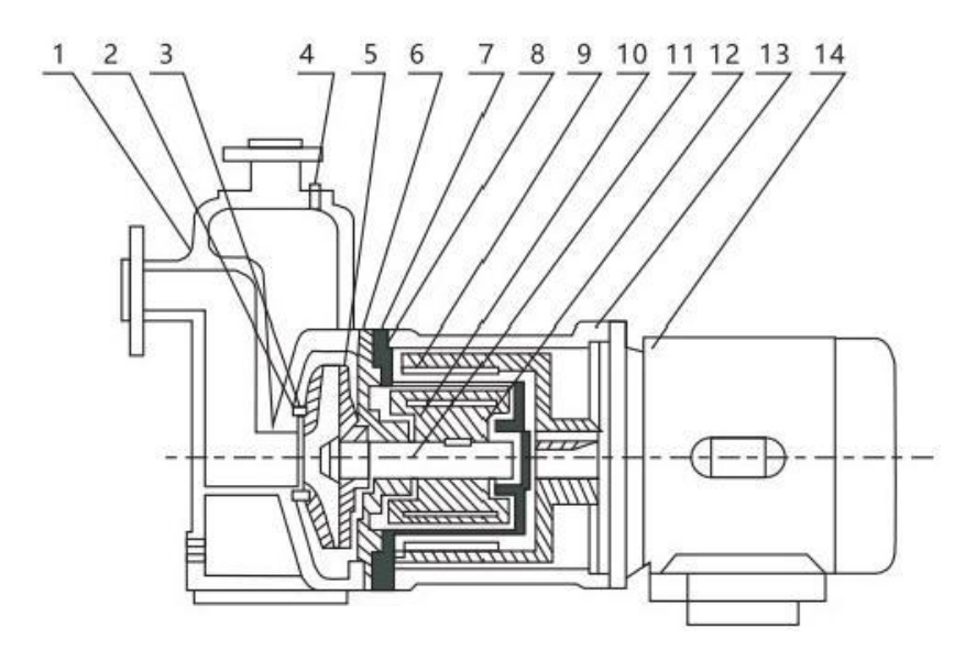 | 1 | Cuerpo de la bomba | 5 | Impulso | 9 | Conjunto de imán exterior | 13 | Marco de conexión |
