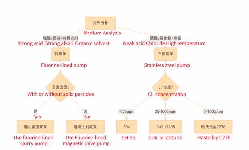 **Alta temperatura y alta concentración**: Se prefieren las bombas de accionamiento magnético de acero inoxidable de alta aleación (por ejemplo, 316L) o fluoroplástico.